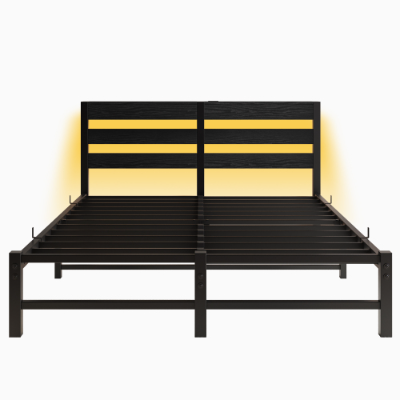 Queen Size Metal Bed Frame With Wooden Headboard and RGB lights